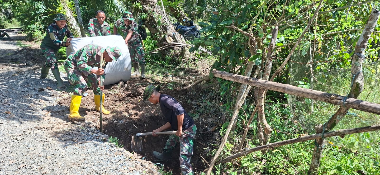 Pemasangan gorong-gorong ini bertujuan untuk memastikan kelancaran aliran air menuju lahan pertanian dan perkebunan milik warga. Di bawah terik matahari, personel Satgas dan masyarakat tampak kompak bahu membahu menurunkan material, mengatur posisi cincin, hingga melakukan penimbunan dan perapian badan jalan.