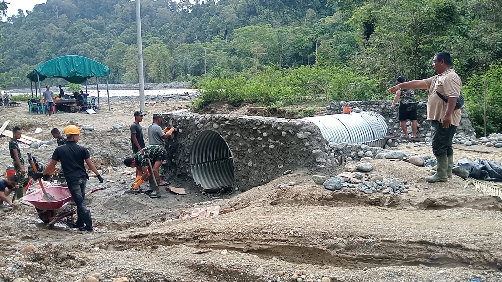 Dandim 0105/Abar, Letkol Inf S. Kembaren, S.E., M.I.P., CFrA., menjelaskan bahwa pembangunan wing wall ini merupakan langkah strategis untuk menjaga ketahanan konstruksi jembatan secara keseluruhan.