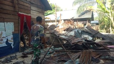 Rumah kecil berdinding rapuh dengan sebagian atap daun rumbia itu kini dibongkar dan diobrak-abrik oleh Personel Satgas TMMD bersama masyarakat setempat untuk direnovasi total. Kayu-kayu lapuk dilepas, dinding usang diruntuhkan, menjadi tanda dimulainya harapan baru bagi Ani Sarlini.