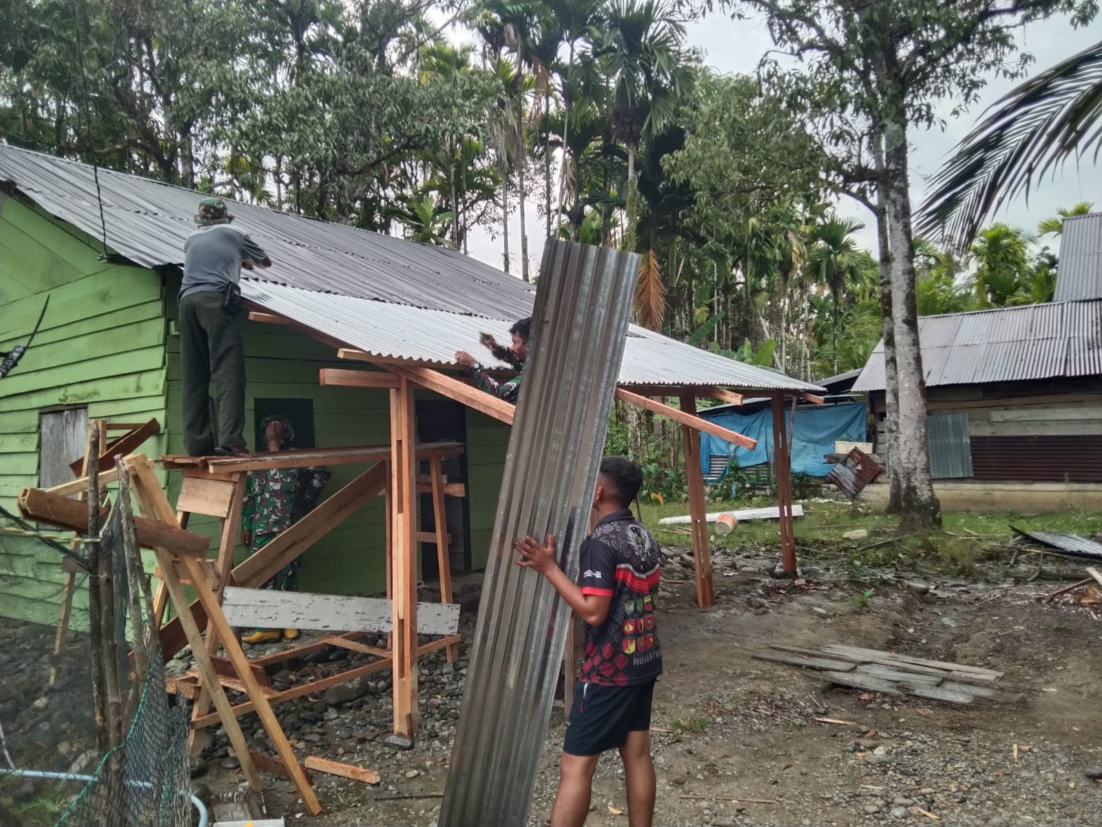 Tahap pemasangan atap menjadi penanda bahwa struktur utama bangunan telah berdiri kokoh dan kini memasuki fase penyempurnaan. Serda Joneri bersama warga terlihat bahu-membahu mengangkat dan memasang lembaran seng secara hati-hati agar terpasang kuat serta tahan terhadap cuaca.