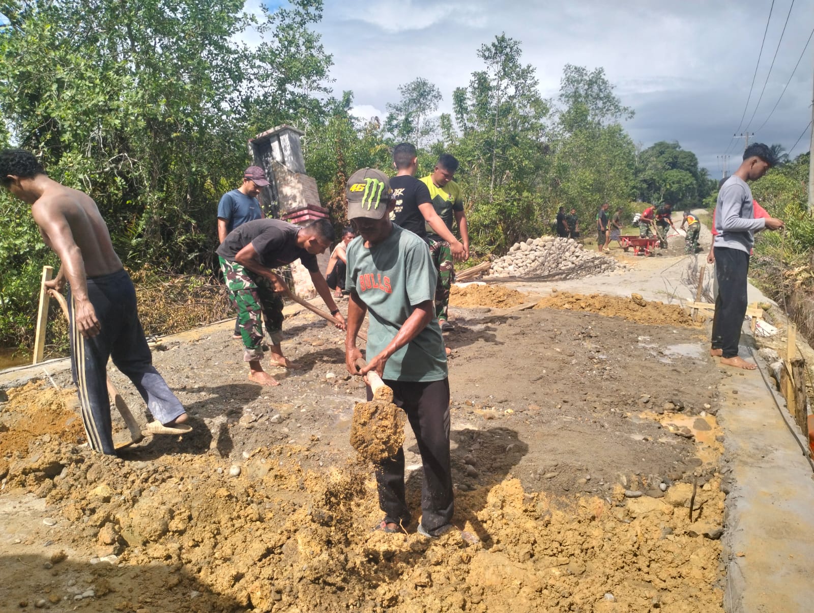 Pada tahap saat ini, pekerjaan difokuskan pada penimbunan badan jembatan sebagai bagian dari upaya memperkuat struktur dan memastikan akses dapat segera difungsikan oleh masyarakat. Kegiatan tersebut dilakukan secara bersama-sama dengan penuh semangat, mencerminkan sinergi antara TNI dan warga dalam mendukung percepatan pembangunan infrastruktur di daerah.